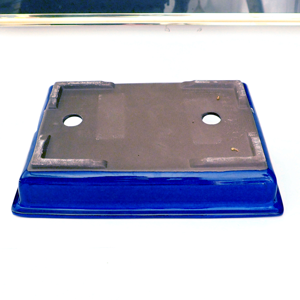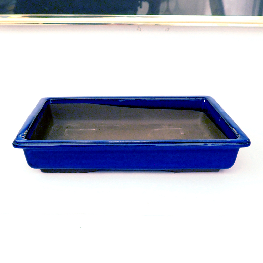 Rektangulär bonsaikruka med blå glasyr.